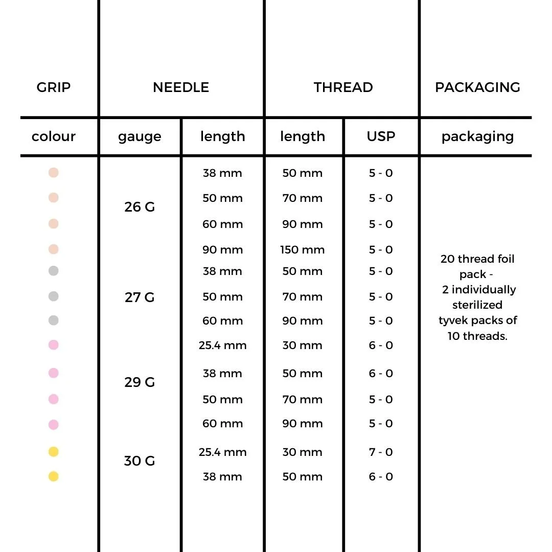 Our monos come in 4 different needle gauges. Each gauge has a different colour grip. Each gauge has different options in both needle and thread length.